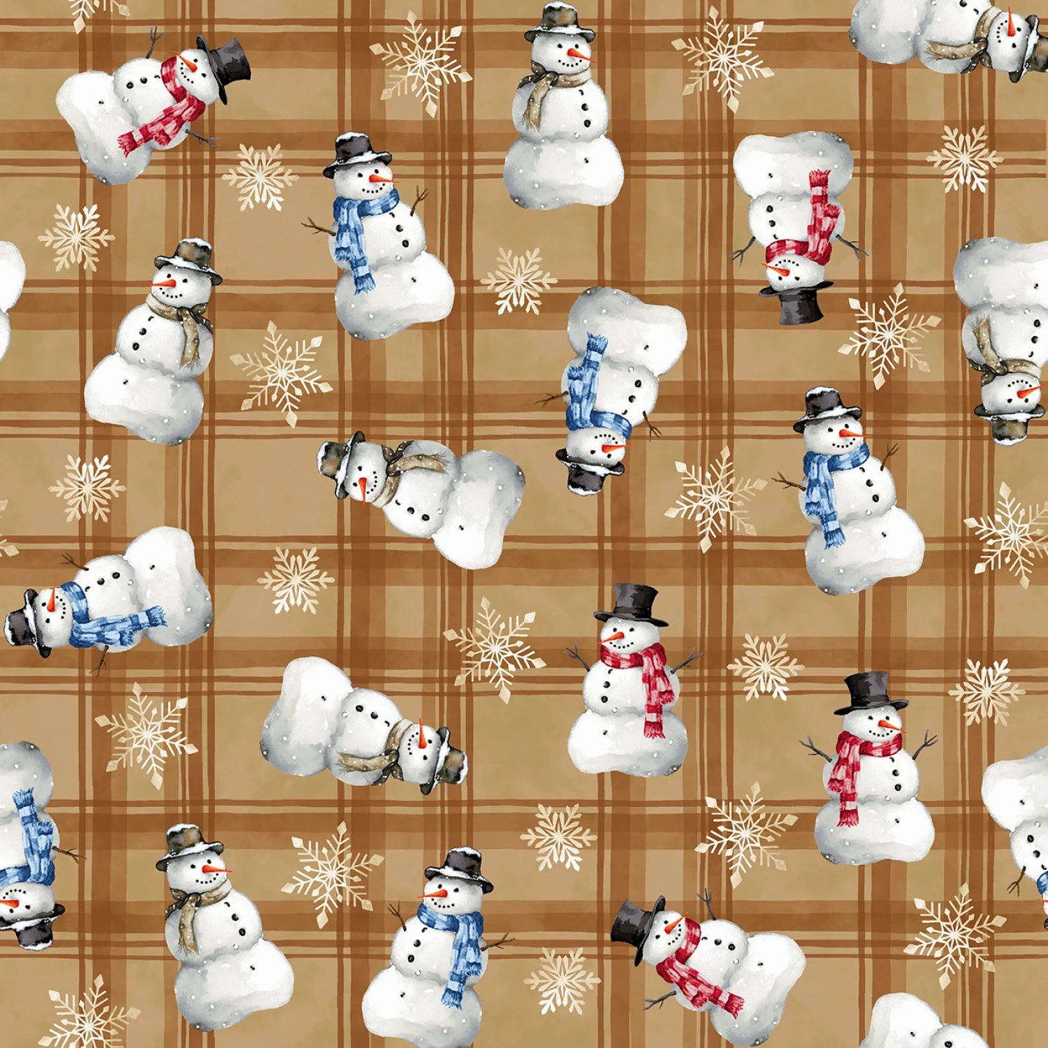 This delightful fabric features a charming pattern of snowmen scattered across a warm, caramel-colored plaid background. Each snowman is uniquely dressed in winter attire, including scarves, hats, and mittens, adding a playful and festive touch to the design. The snowmen are depicted in various poses, creating a dynamic and engaging visual effect. Perfect for holiday crafts, quilting, or any winter-themed project, this fabric brings a cozy and cheerful vibe to your creations.