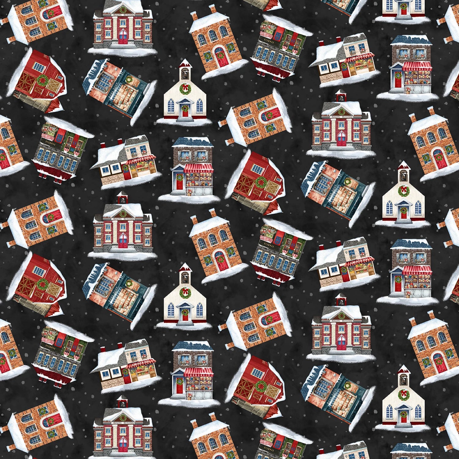 This charming fabric features a delightful array of village buildings, each uniquely illustrated with a festive touch, set against a deep black background. The design showcases a variety of architectural styles, from quaint cottages to elegant townhouses, all adorned with wreaths and holiday decorations, creating a cozy winter village scene. The buildings are arranged in a playful, scattered pattern with an 8-inch repeat, making it perfect for holiday-themed projects or adding a touch of seasonal cheer to any fabric craft.