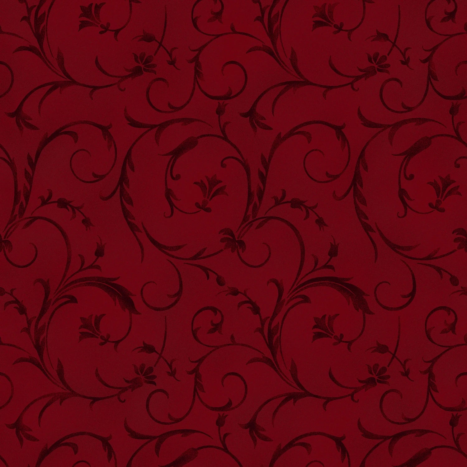 This rich burgundy fabric features an elegant, repeating pattern of swirling vines and delicate floral motifs, creating a sophisticated and timeless look perfect for wide backings in quilting projects. The design's dark floral elements contrast beautifully against the deep red background, offering a luxurious texture that enhances any project it's used in.